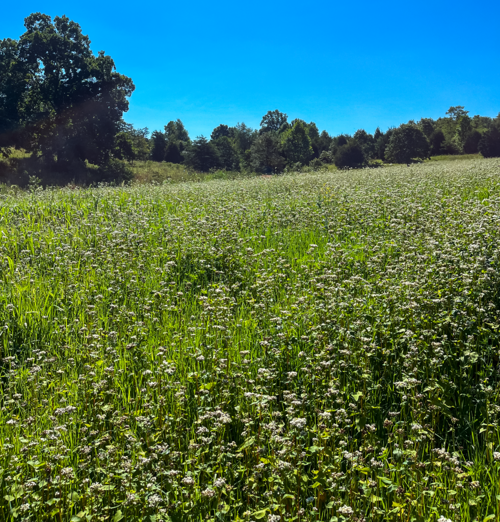Buckwheat is tall and flowering! Ideally, with a clover food plot, it would’ve been ideal to begin top cutting the plot before the buckwheat got this tall and began flowering, but with the number of honeybees we noticed utilizing the buckwheat’s flowers, we decided to allow the flowers to finish their reproductive cycle.